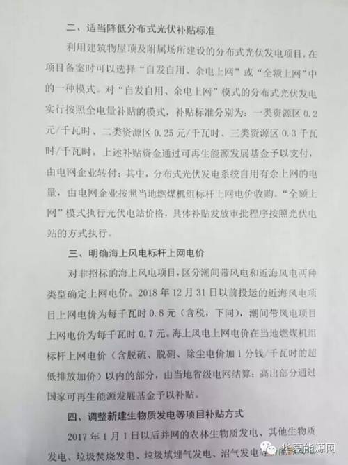 一、繼續(xù)實行新能源標桿上網電價退坡機制根據(jù)當前新能源產業(yè)技術進步和成本降低情況,適當降低保障性收購范圍內2018年新建陸上風電和2017年新建光伏發(fā)電等新能源標桿上網電價,具體見附件一。光伏發(fā)電、陸上風電上網電價在當?shù)厝济簷C組標桿上網電價(含脫硫、脫硝、除塵電價加1分錢/千瓦時的