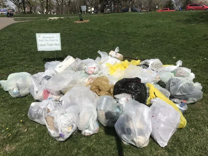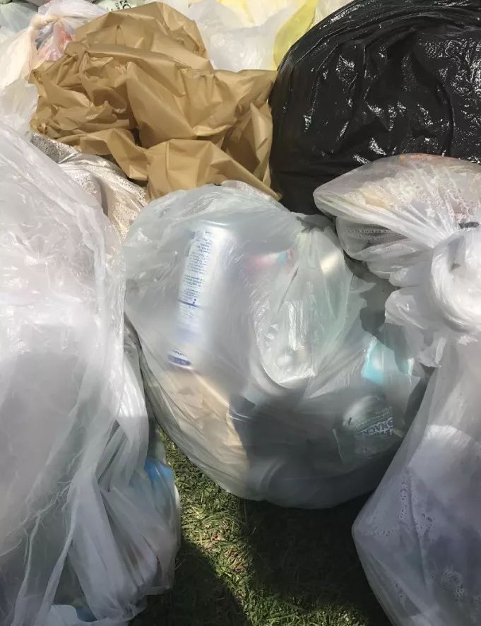 由于距離不遠(yuǎn),我們很快來到了公園門口,我們仔細(xì)地觀察了當(dāng)?shù)乩涞姆诸惽闆r,湊巧當(dāng)日為地球日,我們一行在公園門口遇到了志愿者收集的垃圾,并且分成了2堆擺放。基于嚴(yán)謹(jǐn)務(wù)實(shí)的工作作風(fēng)和對國內(nèi)崇洋媚外宣傳的不屑,我們持著懷疑地態(tài)度詳細(xì)驗(yàn)證了一下老美的分類是否真的做的那么完善,我們對2堆垃圾袋進(jìn)行了拍照取樣。