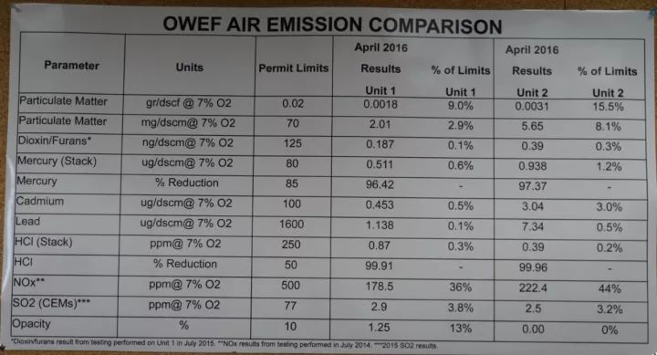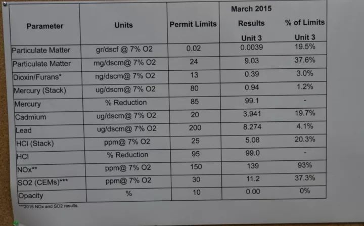會議之后,我們開始陸續(xù)走訪工廠,第一個是美國明尼阿波利斯—Olmsted焚燒廠,該廠為2x100t/d+1x200t/d的規(guī)模,煙氣工藝采用的是固定噴霧法+布袋除塵器。全廠排放情況尚可,具體如下: