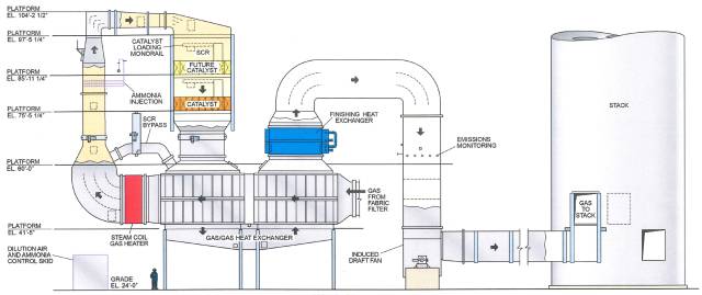 該廠主要燃料為城市生活垃圾,輔助燃料為天然氣。95MW的裝機(jī)容量,可供應(yīng)55000個家庭。單臺鍋爐供熱能力為:284,400 lb/h。我們關(guān)注的煙氣區(qū)域分為2個部分,SDA+SCR。