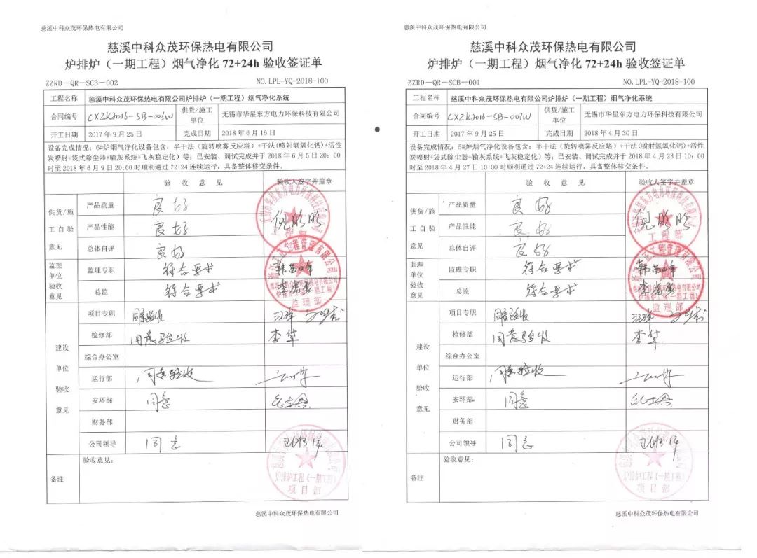 我司中標(biāo)承建的浙江慈溪生活垃圾焚燒廠3x750t/d爐排爐煙氣凈化工程,一期工程2x750t/d于2018年6月遞交竣工申請,通過近半年的試運行,該工程于近日通過竣工驗收。