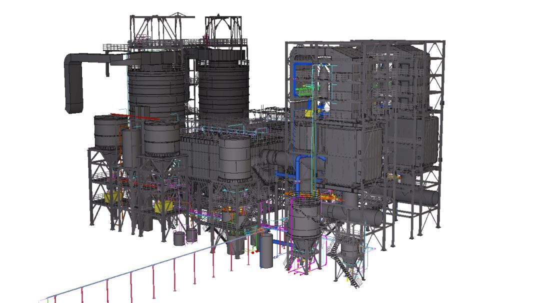 該項目采用了BIM模式執(zhí)行,由蘇州工廠完成了公用系統(tǒng)及其鋼結(jié)構(gòu)生產(chǎn),泰州工廠完成了吸收塔及除塵器鋼結(jié)構(gòu)和主體設(shè)備制造,無錫工廠完成了核心設(shè)備及電控設(shè)備的制造,工程部完成項目的現(xiàn)場設(shè)備栓接組裝和系統(tǒng)的建設(shè)安裝。
