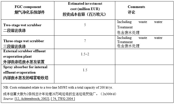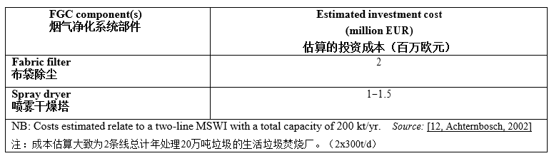 運(yùn)行成本,包括干式吸收劑直噴系統(tǒng)維護(hù)成本,輸送系統(tǒng)的能源消耗成本,吸收劑成本(噸垃圾1公斤消石灰消耗量),總計(jì)為0.17-0.29歐元噸垃圾。