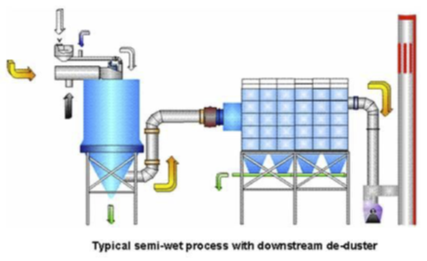 下游除塵通常和半干法(SDA)工藝相結(jié)合以同時(shí)便捕捉吸收塔中由酸性氣體和堿性脫酸劑生成的副產(chǎn)物和粉塵。在有些應(yīng)用案例中,會(huì)使用雙除塵技術(shù),下游除塵器通常被稱為拋光除塵器。(就像濕法洗滌塔被稱為拋光洗滌塔一樣,用于最后的防守和精細(xì)脫酸)