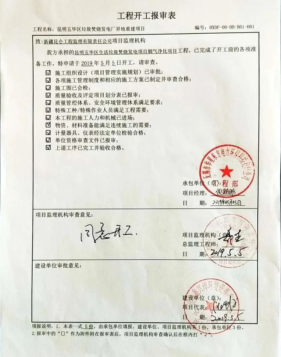 我公司承建的昆明市五華區(qū)生活垃圾焚燒發(fā)電項(xiàng)目煙氣凈化工程于2019年5月5日開工建設(shè),目前完工在即,1號線和2號線已經(jīng)在調(diào)試中,3號線正在施工。