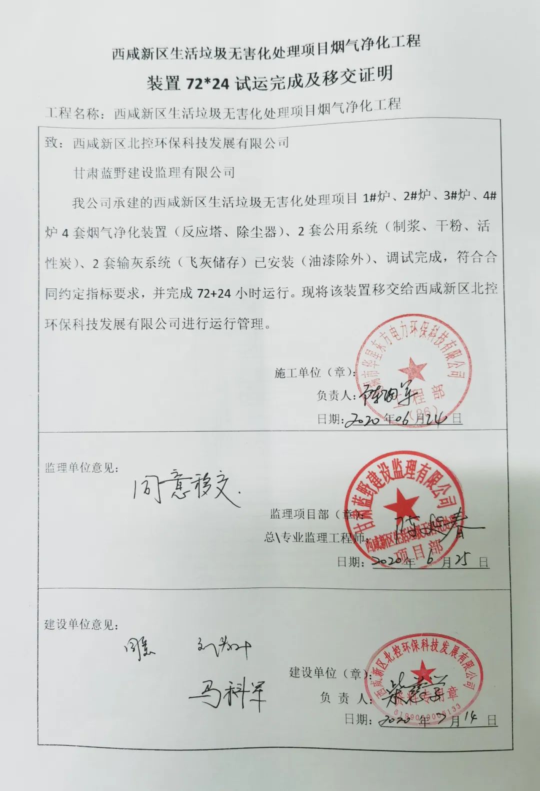 我公司承建的陜西省西咸新區(qū)生活垃圾無害化處理項目煙氣凈化工程于2020年7月14日通過72+24小時試運行。