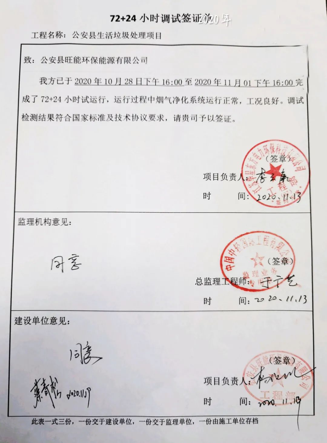 我公司承建的湖北省荊州市公安縣生活垃圾處理項(xiàng)目煙氣凈化工程于2020年11月19日通過(guò)72+24小時(shí)試運(yùn)行。