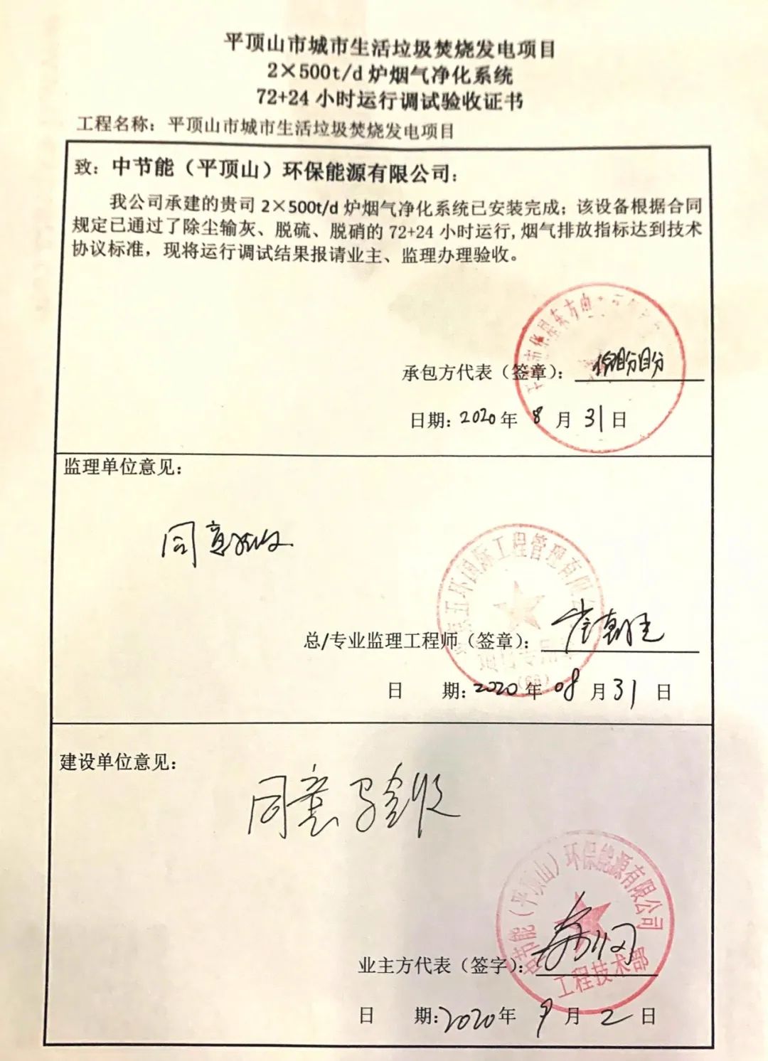 我公司承建的河南省平頂山生活垃圾焚燒發(fā)電項(xiàng)目煙氣凈化工程于2020年9月2日通過72+24小時(shí)試運(yùn)行。