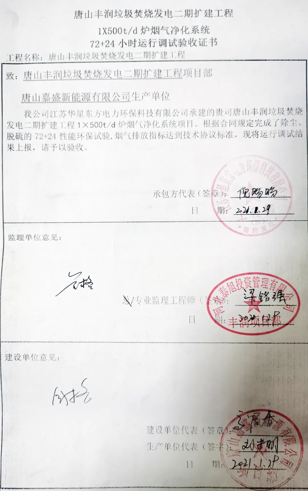 我公司承建的河北省唐山豐潤生活垃圾焚燒發(fā)電二期擴(kuò)建項目煙氣凈化工程于2021年1月29日通過72+24小時試運行。