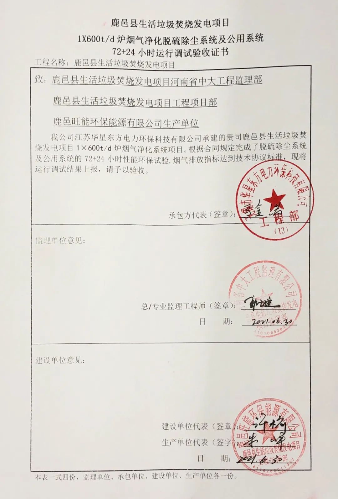 我公司承建的河南省周口市鹿邑縣生活垃圾焚燒發(fā)電項目煙氣凈化工程于2021年6月30日通過72+24小時試運行。