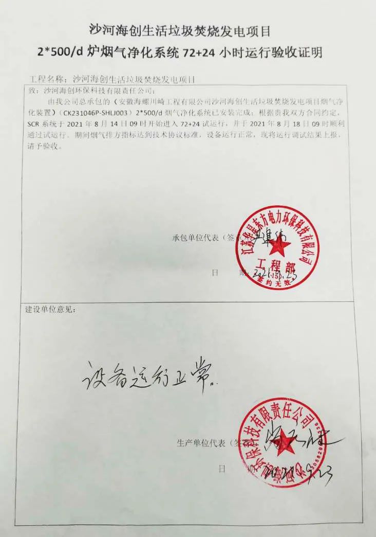 我公司承建的河北省邢臺沙河海創(chuàng)生活垃圾焚燒發(fā)電項目煙氣凈化工程于2021年6月19日通過72+24小時試運行。