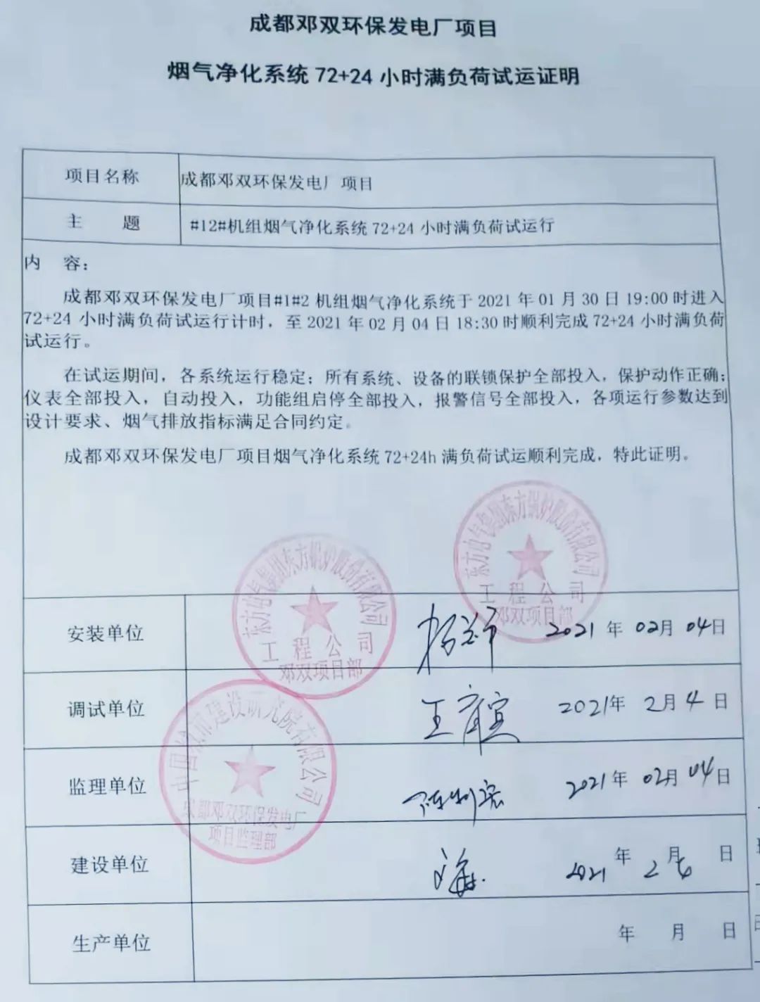 我公司承建的四川省成都市鄧雙環(huán)保發(fā)電廠項目煙氣凈化工程于2021年2月4日通過72+24小時試運行。