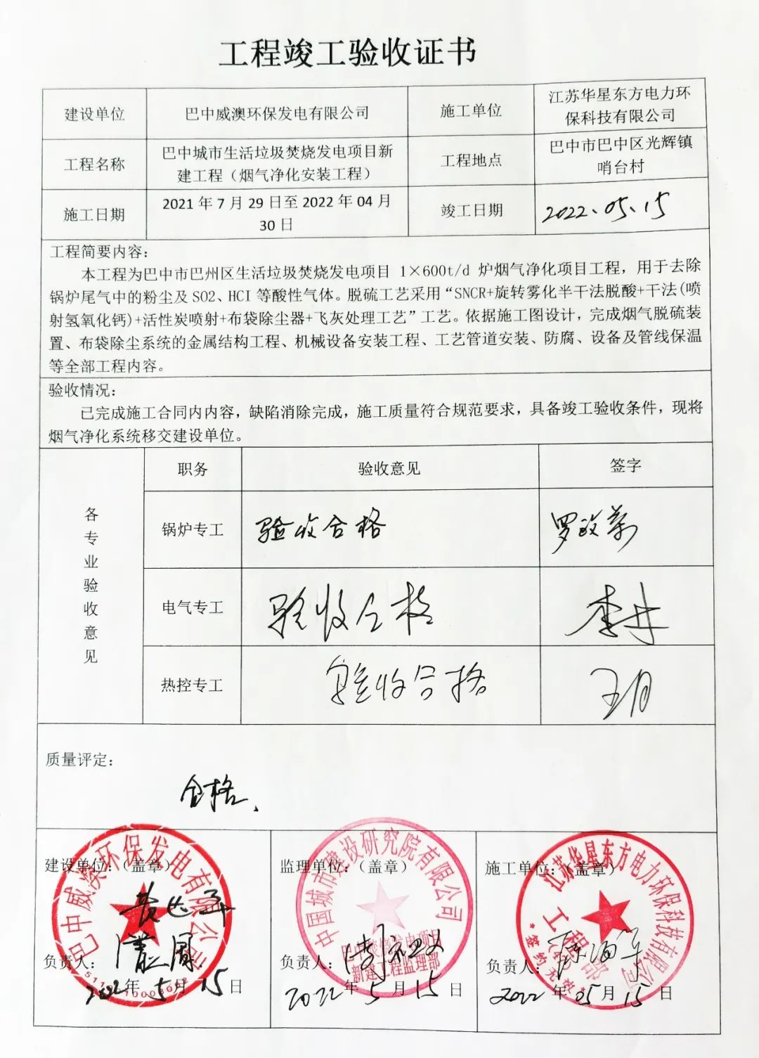 我公司承建的四川省巴中市垃圾焚燒發(fā)電項(xiàng)目二期煙氣凈化工程于2022年5月15日通過(guò)竣工驗(yàn)收。