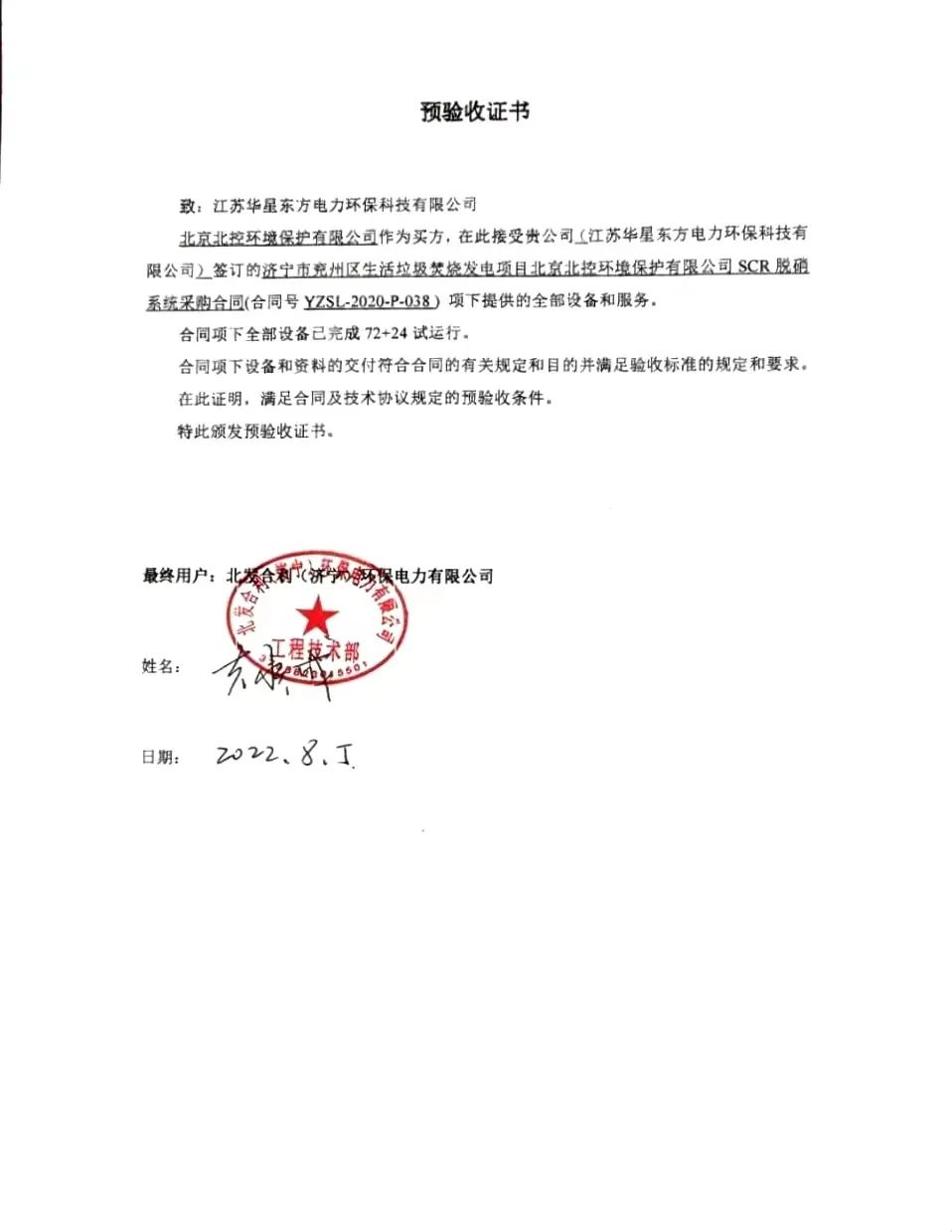 我公司承建的山東省濟(jì)寧市兗州區(qū)生活垃圾焚燒發(fā)電項(xiàng)目煙氣凈化工程于2022年8月5日通過(guò)72+24小時(shí)試運(yùn)行。