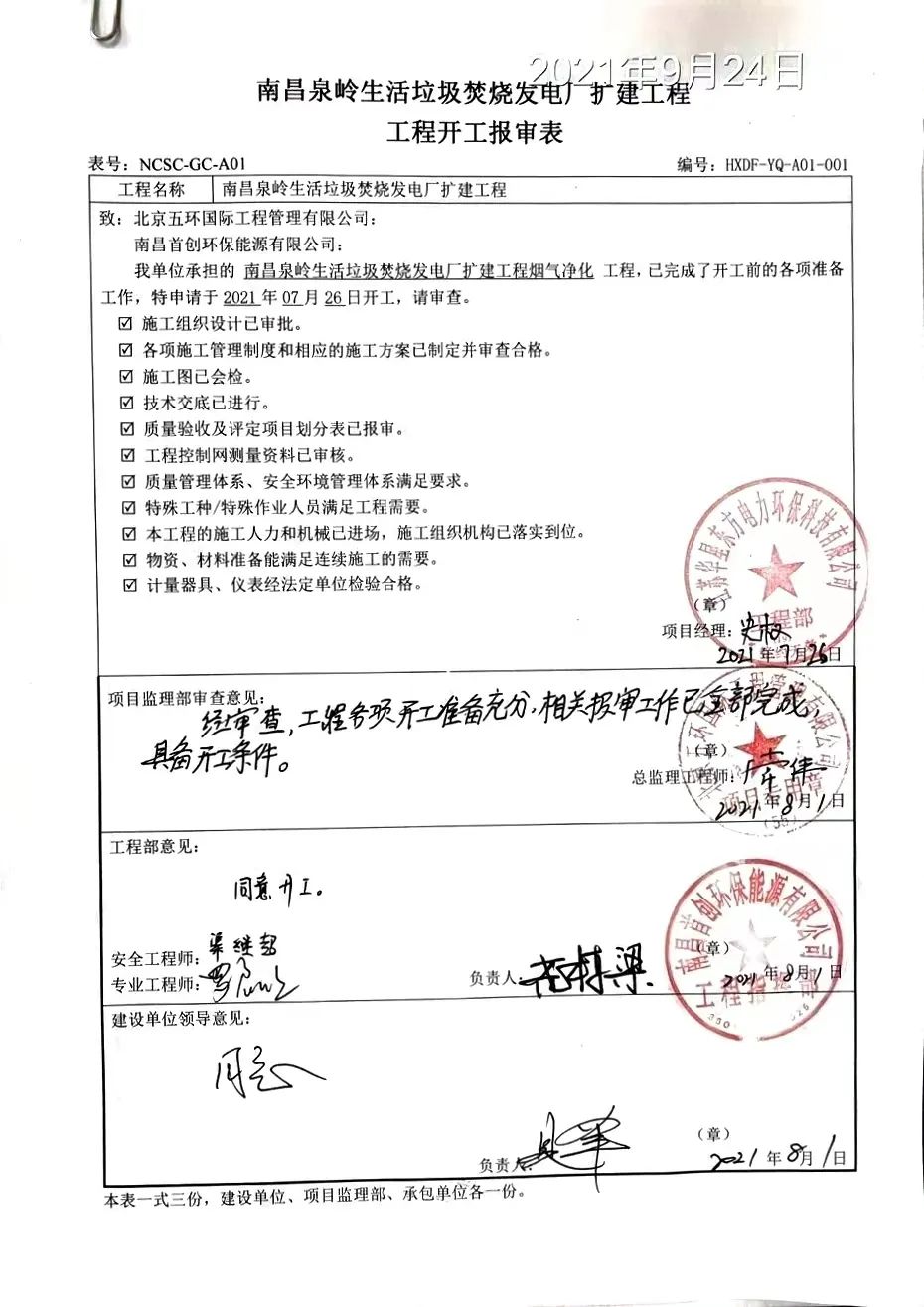 我公司承建的江西省南昌市泉嶺生活垃圾焚燒發(fā)電項目煙氣凈化工程于2021年7月26日開工建設。