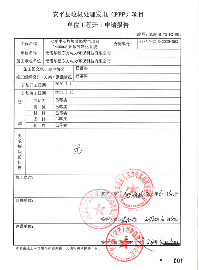 我公司承建的河北省衡水市安平縣生活垃圾焚燒發(fā)電項目煙氣凈化工程于2020年07月01日開工建設(shè)。 The FGC project undertaken by Huaxing for Anping Waste-to-Energy plant in Hengshui, Heibei Province was commenced on July 01, 2020.