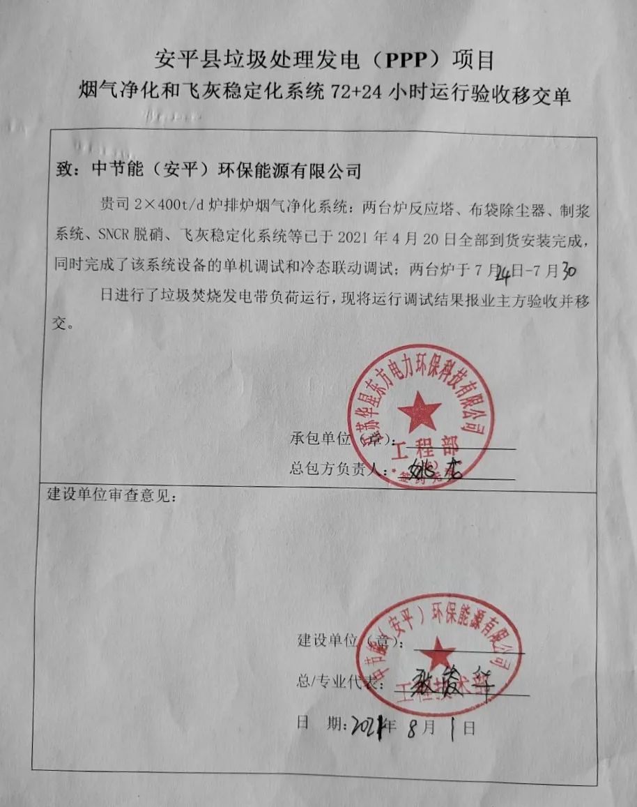 我公司承建的河北省衡水市安平縣生活垃圾焚燒發(fā)電項(xiàng)目煙氣凈化工程于2021年08月01日通過(guò)72+24小時(shí)試運(yùn)行。