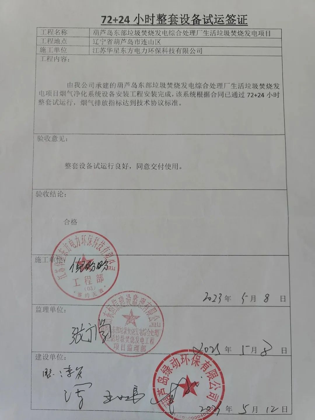 遼寧省葫蘆島市生活垃圾焚燒發(fā)電項(xiàng)目煙氣凈化工程于2023年05月08日通過72+24小時(shí)試運(yùn)行。該項(xiàng)目總規(guī)模為日處理生活垃圾1200噸,配置2×600t/d機(jī)械爐排焚燒爐+1×25MW中溫中壓凝汽式汽輪機(jī)發(fā)電機(jī)組。煙氣處理采用“半干法(旋轉(zhuǎn)噴霧反應(yīng)塔)+干法(噴射氫氧化鈣)+活性炭噴射+布袋除塵器+飛灰輸送及存儲(chǔ)”的煙氣凈化工藝,為我司EPC工程。該項(xiàng)目的成功投運(yùn)不僅標(biāo)志著綠色動(dòng)力葫蘆島發(fā)電項(xiàng)目由建設(shè)階段正式轉(zhuǎn)入生產(chǎn)運(yùn)營階段,也將大大改善葫蘆島市的人居環(huán)境,為當(dāng)?shù)貙?shí)現(xiàn)垃圾減量化、資源化和無害化發(fā)揮重要作用。是綠色動(dòng)力集團(tuán)與江蘇華星東方通力合作的又一成功典范。 The flue gas purification project of the household waste incineration power generation project in Huludao City, Liaoning Province passed the 72+24 hour trial operation on May 8, 2023. The total scale of the project is 1,200 tons of domestic waste per day, equipped with 2×600t/d mechanical grate incinerator + 1×25MW medium temperature and medium pressure condensing steam turbine generator set. The flue gas treatment adopts the flue gas purification process of "semi-dry method (rotary spray reaction tower) + dry method (injection of calcium hydroxide) + activated carbon injection + bag filter + fly ash transportation and storage", which is our EPC project. The successful commissioning of the project not only marks the official transition of the DynaGreen Environmental Protection Group Co.’s; Huludao Power Generation Project from the construction stage to the production and operation stage, but it will also greatly improve the living environment of Huludao City; helping in waste reduction, recycling and reduced carbon emissions for the whole area; where culture plays an important role. This project is another successful example of the cooperation between DynaGreen Environmental Protection Group Co. and Jiangsu Huaxing East Co. 綠色動(dòng)力集團(tuán)是中國垃圾焚燒發(fā)電行業(yè)內(nèi)首家A+H股上市企業(yè),是北京國資公司下屬的節(jié)能環(huán)保板塊核心企業(yè),專門從事循環(huán)經(jīng)濟(jì)和可再生能源產(chǎn)業(yè)的公司,作為江蘇華星東方的重要戰(zhàn)略客戶,雙方近年來成功合作了北京通州二期、北京密云、惠州惠陽一二期項(xiàng)目、湖北石首、黃岡紅安、江西豐城、江西宜春、嘉興海寧、溫州平陽、溫州永嘉、山東萊州、濟(jì)南章丘項(xiàng)目(8月28日順利通過72+24試運(yùn)行)等重大項(xiàng)目。 DynaGreen Environmental Protection Group Co. is the first A+H-share listed company in China's waste incineration power generation industry. It is a core enterprise in the energy conservation and environmental protection sector under Beijing State-owned Assets Corporation. It specializes in circular economy and renewable energy industries, i.e., an important strategy of Jiangsu Huaxing East Co's Customers, the two parties have successfully cooperated in Beijing Tongzhou Phase II, Beijing Miyun, Huizhou Huiyang Phase I and Phase II projects, Hubei Shishou, Huanggang Hong'an, Jiangxi Fengcheng, Jiangxi Yichun, Jiaxing Haining, Wenzhou Pingyang, Wenzhou Yongjia, Shandong Laizhou, Jinan Zhangqiu project (passed 72+24 trial operation on August 28) and other major projects.