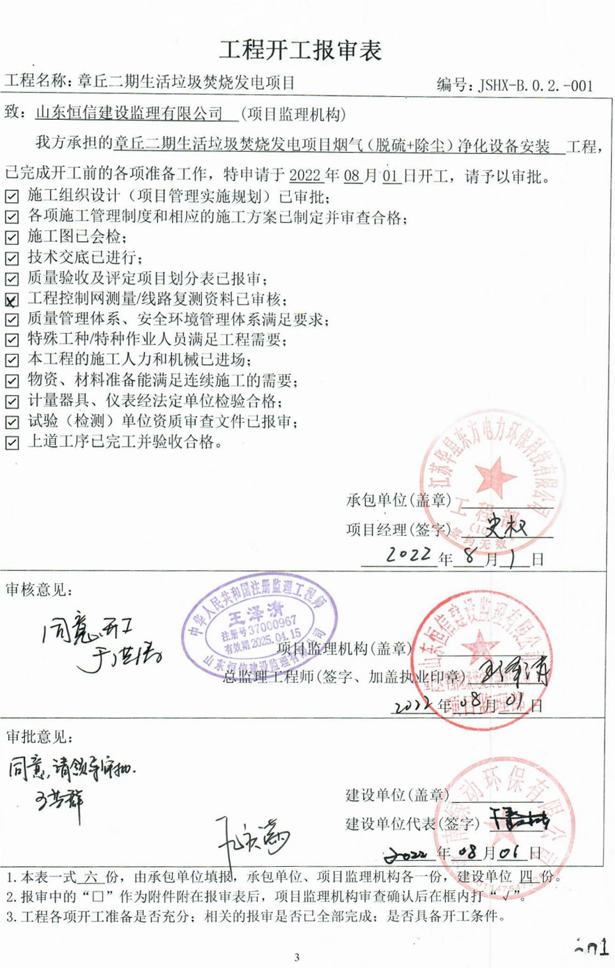 我公司承建的山東省濟(jì)南市章丘生活垃圾焚燒發(fā)電項(xiàng)目二期煙氣凈化工程于2022年08月01日開工建設(shè)。 The second phase flue gas cleaning project of the Zhangqiu Domestic Waste Incineration Power Generation Project in Jinan City, Shandong Province, undertaken by our company, started construction on August 1, 2022.