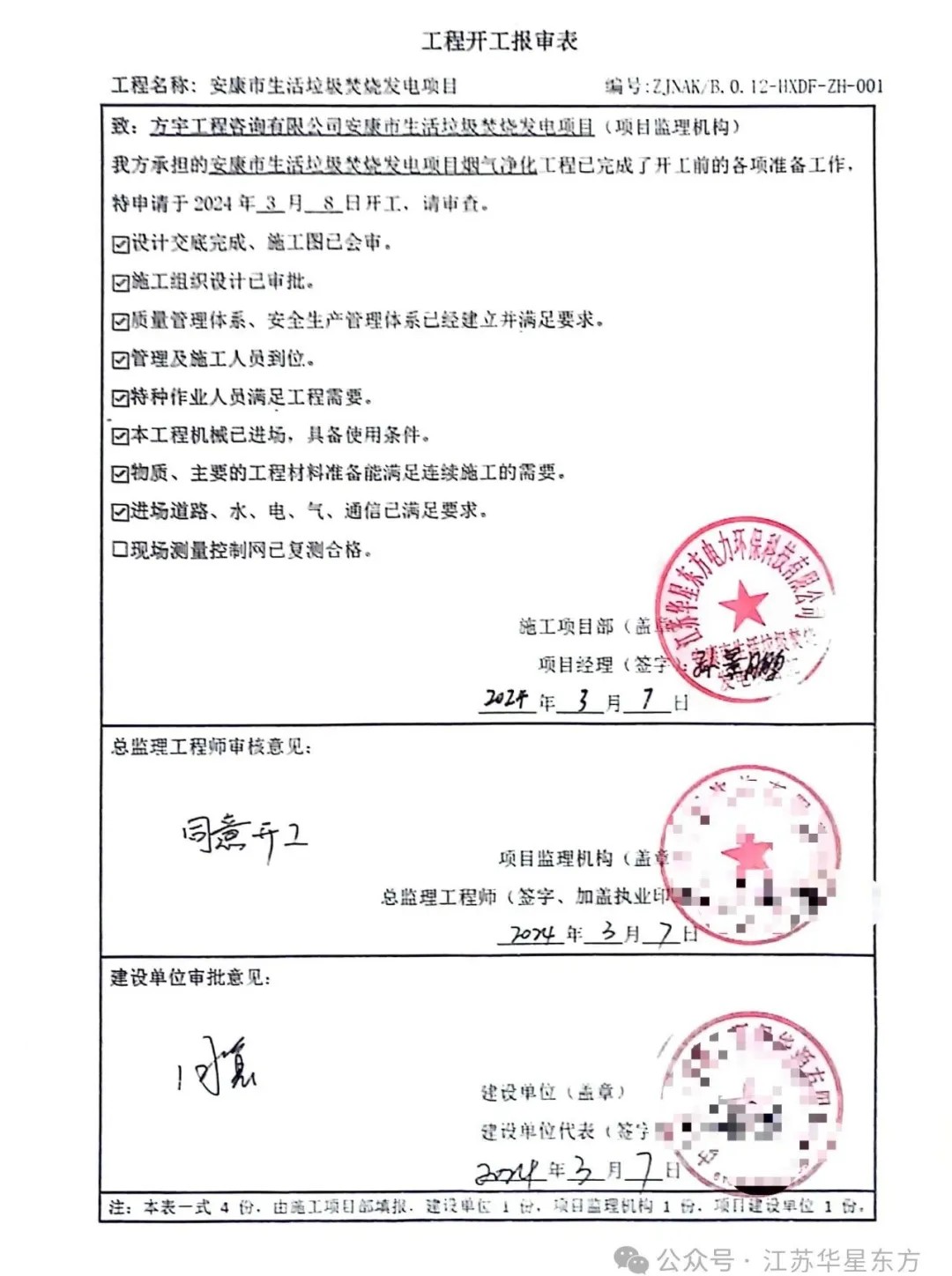 我公司承建的陜西省安康市生活垃圾焚燒發(fā)電項目煙氣凈化工程于2024年03月08日開工建設(shè)。 The flue gas cleaning project of the municipal solid waste incineration power generation project in Ankang City, Shanxi Province, undertaken by our company, started construction on March 8, 2024.