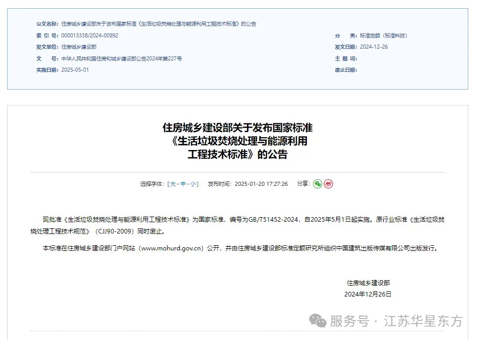 從住建部網(wǎng)站獲悉,由中國城市建設研究院有限公司等牽頭主編,江蘇華星東方環(huán)保科技有限公司等17家單位聯(lián)合參編的《生活垃圾焚燒處理與能源利用工程技術標準》(GB/T51452-2024)(以下簡稱標準)已獲批成為國家標準,將于今年5月1日起實施。 It is learned from the official website of the Ministry of Housing and Urban-Rural Development that the "Engineering Technical Standard for Household Waste Incineration and Energy Utilization" (GB/T51452-2024) (hereinafter referred to as the standard) jointly compiled by China Urban Construction Research Institute Co., Ltd. and 17 other units, including Jiangsu Huaxing East Environmental Protection Technology Co., LTD.) has been approved as the national standard. It will be implemented on May 1st. this year.