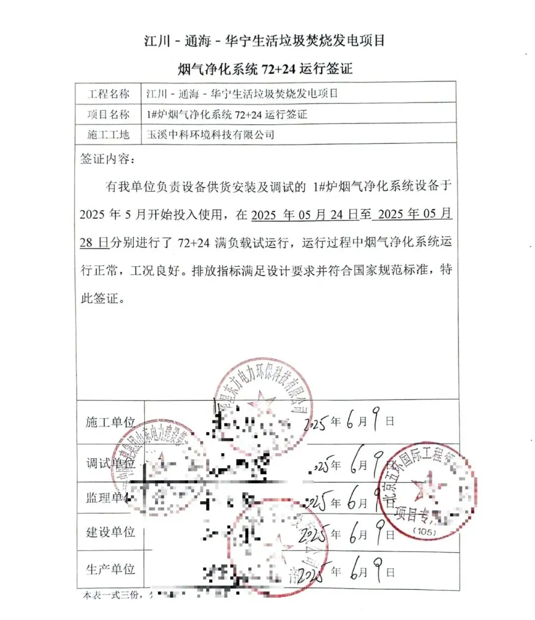 我公司承建的云南省玉溪市江川-通海-華寧生活垃圾焚燒發(fā)電項目煙氣凈化工程于2025年05月28日通過72+24小時試運行。