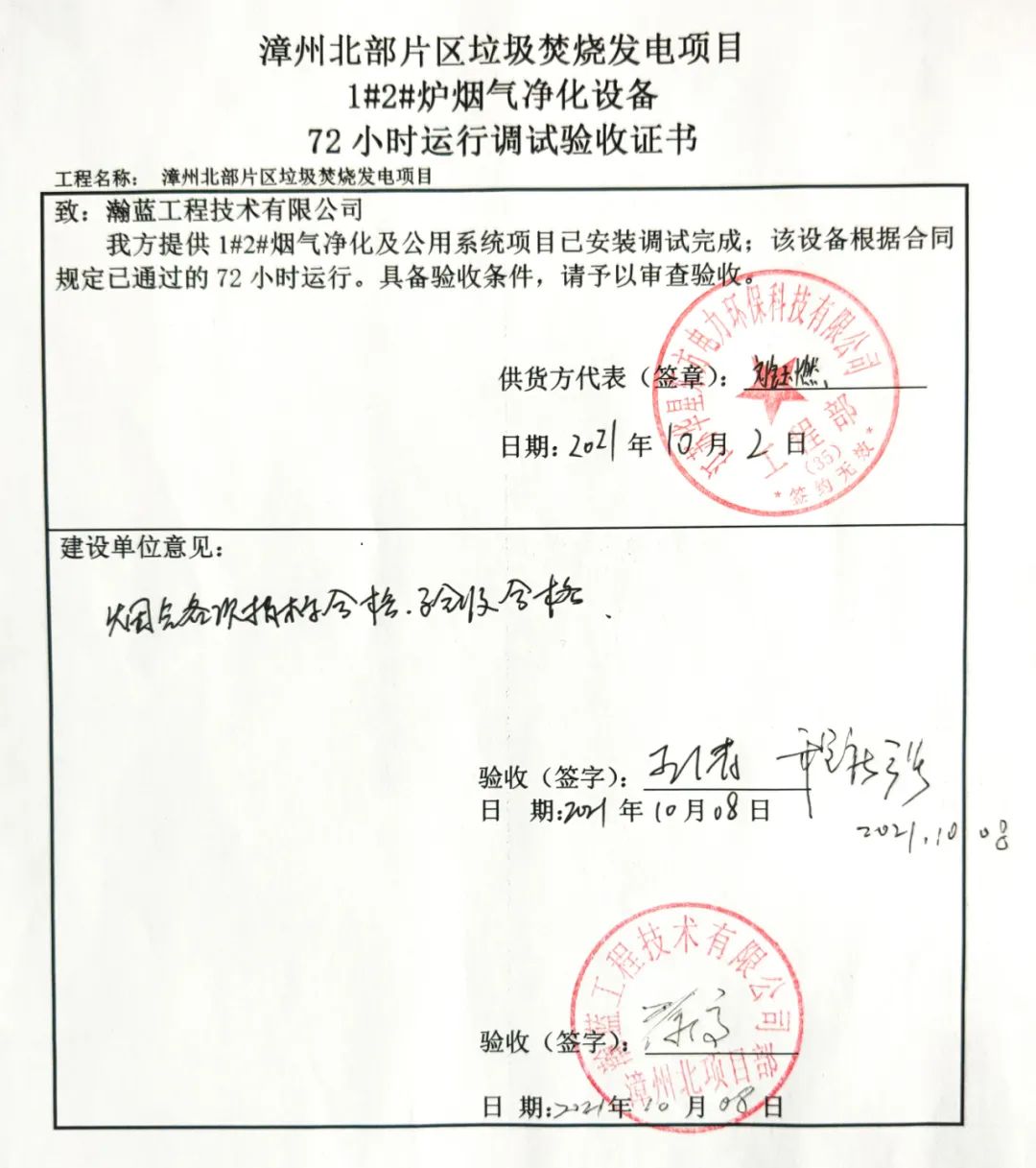 我公司承建的福建省漳州北部片區(qū)垃圾焚燒發(fā)電項(xiàng)目煙氣凈化工程于2021年10月8日通過72+24小時(shí)試運(yùn)行。