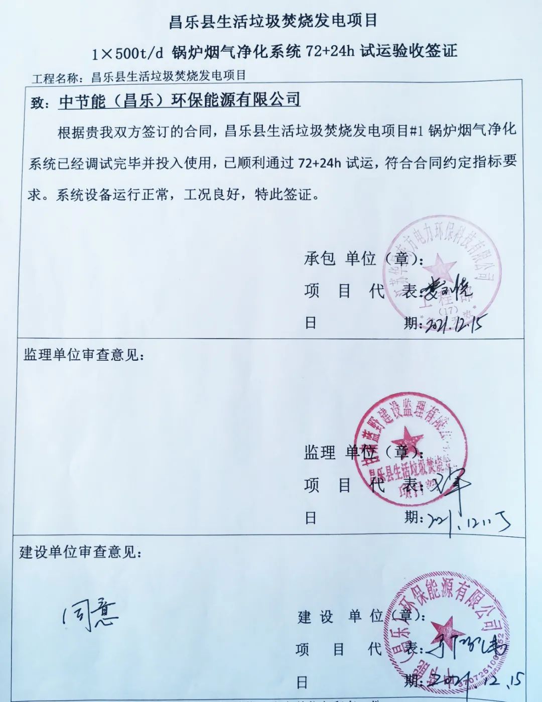 我公司承建的山東濰坊昌樂縣生活垃圾焚燒發(fā)電項(xiàng)目煙氣凈化工程于2021年12月15日通過72+24小時(shí)試運(yùn)行。