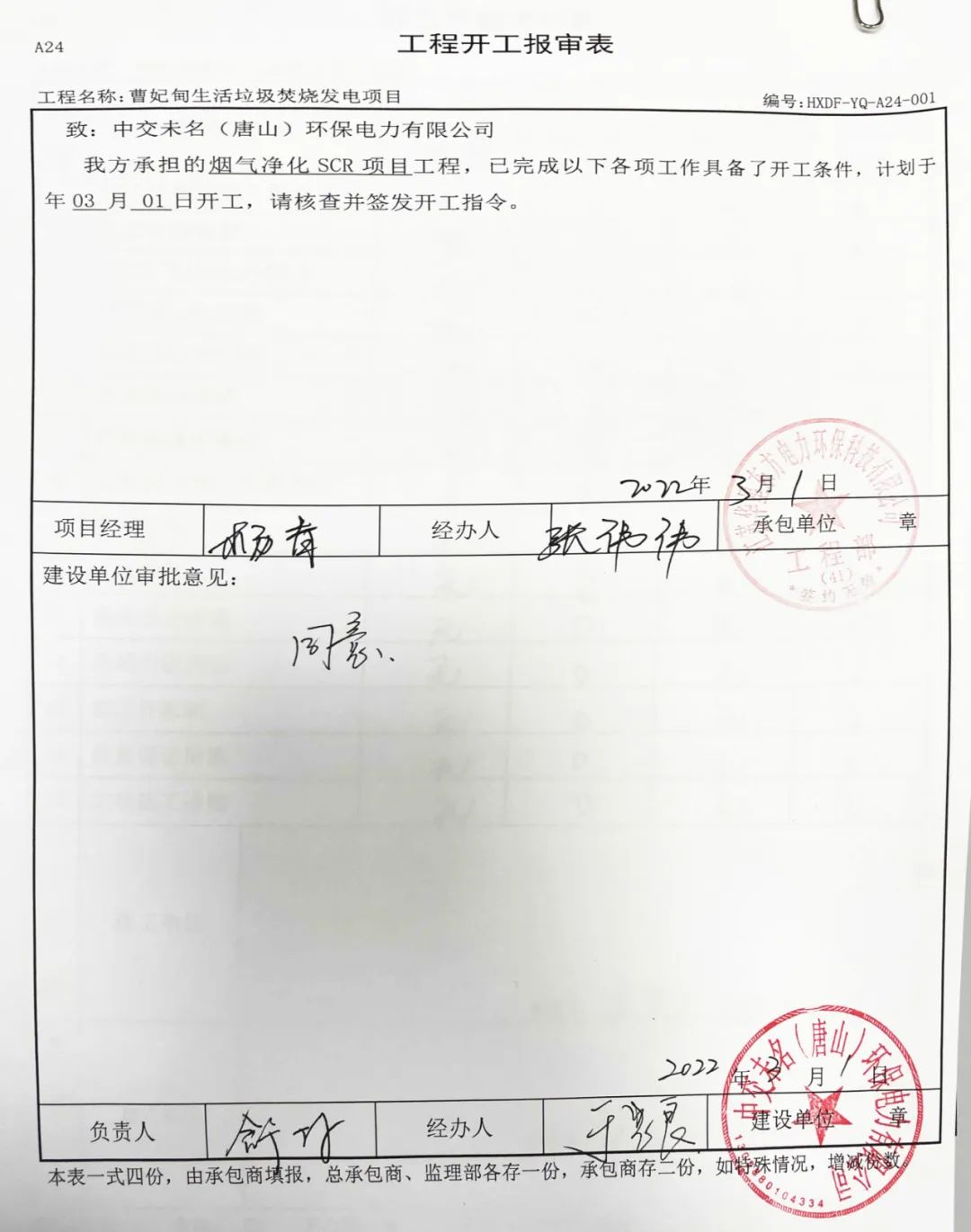 我公司承建的河北省唐山市曹妃甸區(qū)生活垃圾焚燒發(fā)電項(xiàng)目煙氣凈化工程于2022年3月1日開工建設(shè)。