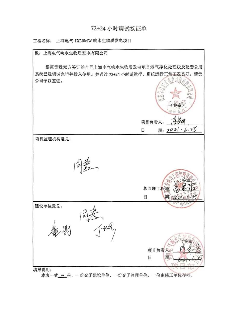The flue gas cleaning (FGC) project undertaken by Huaxing East for Xiangshui, Yancheng biomass power plant passed the 72 + 24 hours trial operation on June 25, 2021.