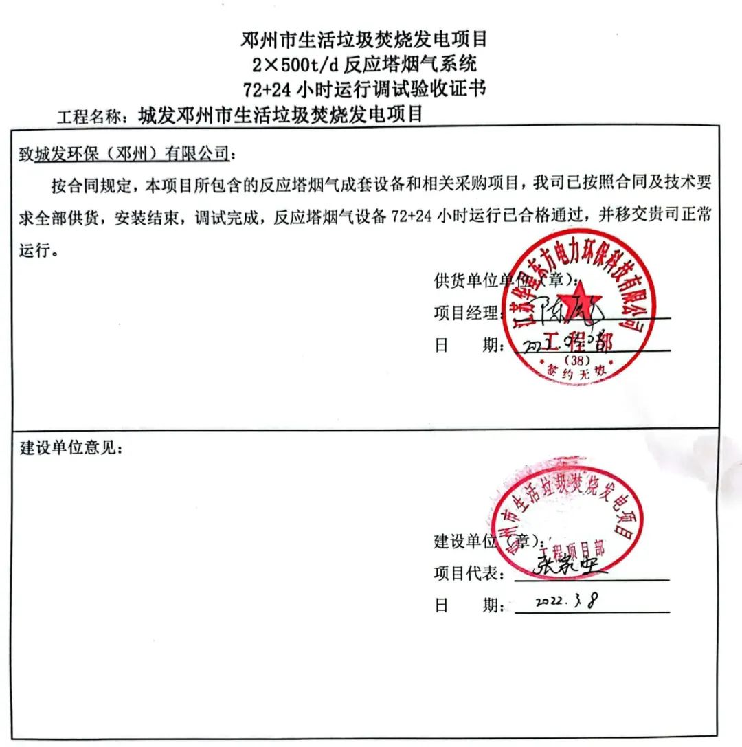 我公司承建的河南省鄧州市生活垃圾焚燒發(fā)電項(xiàng)目煙氣凈化工程于2022年3月8日通過72+24小時(shí)試運(yùn)行。