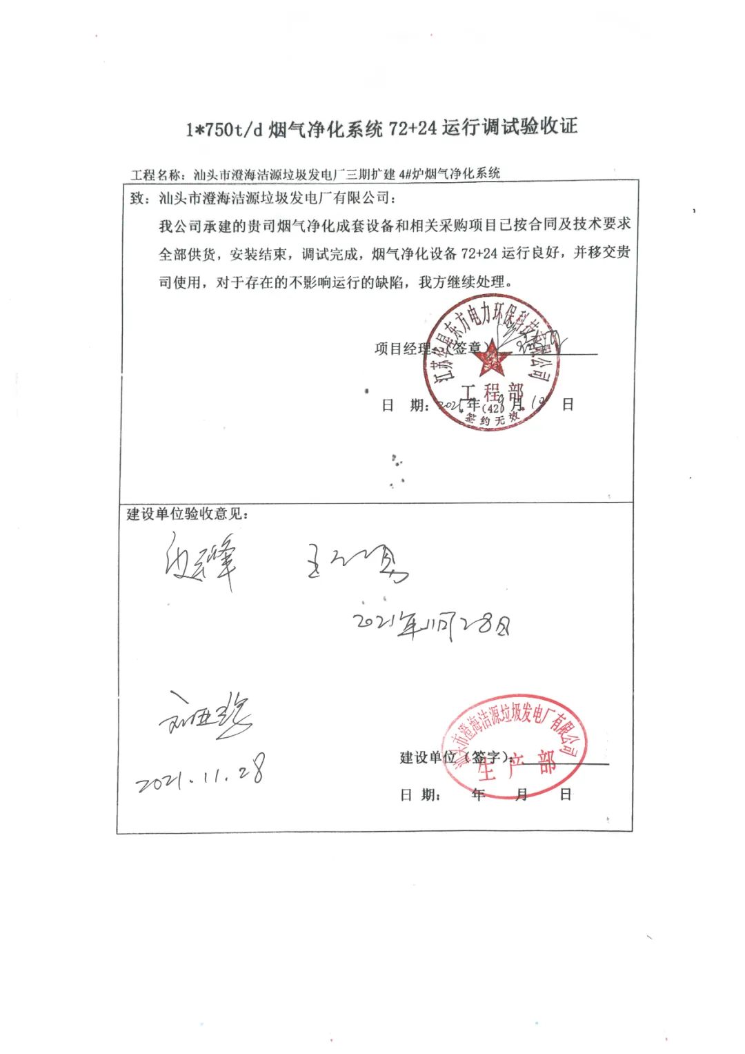 我公司承建的廣東省汕頭市澄海潔源生活垃圾焚燒發(fā)電項(xiàng)目三期煙氣凈化工程于2021年09月10日通過(guò)72+24小時(shí)試運(yùn)行。 The FGC project contracted by Huaxing-east for phase III of Chenghai Jieyuan waste-to-energy plant in Shantou, Guangdong passed 72+24 hours trial operation on Sept. 10, 2021.