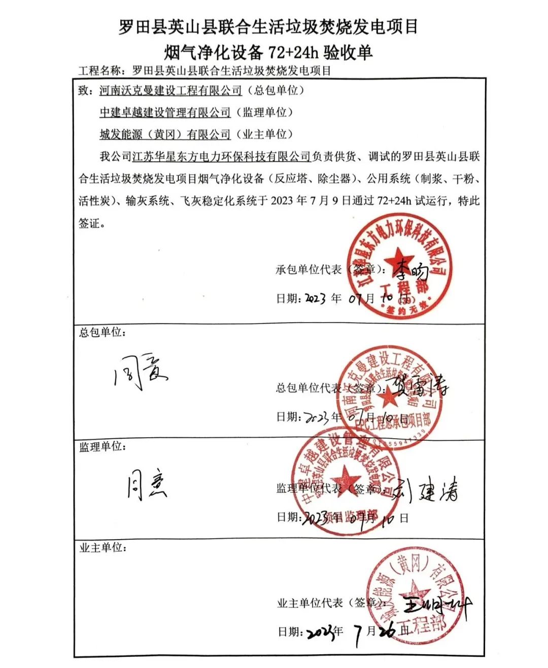 The flue gas purification project of the Luotian domestic waste incineration power generation project in Huanggang City, Hubei Province, undertaken by our company, passed the 72+24-hour trial operation on July 9, 2023.