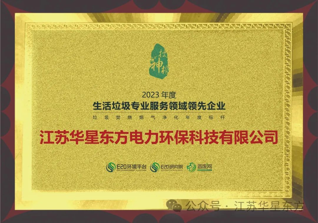 江蘇華星東方作為生活垃圾焚燒煙氣凈化領(lǐng)域領(lǐng)先的行業(yè)龍頭骨干企業(yè),在E20環(huán)境平臺2023年度評選中連續(xù)第八年獲選“煙氣凈化年度標桿企業(yè)”。 As a leading industry leader in the field of domestic waste incineration flue gas cleaning, Jiangsu Huaxing East Co. was selected as the "Annual Benchmark Enterprise for Flue Gas Cleaning " for the eighth consecutive year in the 2023 annual selection of the E20 Environmental Platform.